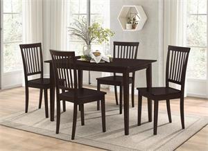 Go all-in on a classic motif with this five-piece dining set. Full of clean lines, the table features a rectangular silhouette with straight edges and square tapered legs. Elegant in style, the side chairs are complete with vertical slat backs that honor timeless design. Contoured wooden seats help to create comfort. Rich and warm, the cappuccino finish puts the finishing touch on a traditional dining room.
