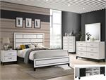 This contemporary bedroom set presents a crisp, clean look with its gray finish and contrasting dark accents. The simple, straight lines and subtle details give it a modern edge. The bed features a paneled headboard that makes a statement without overwhelming the space. The accompanying pieces, including a six-drawer dresser, a five-drawer chest, and a two-drawer nightstand, provide ample storage with a streamlined silhouette. A matching mirror adds functionality and completes the look, creating a cohesive and stylish bedroom environment. This set is perfect for those who appreciate understated style and practical design.