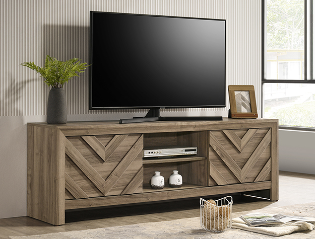 Elevate your living space with this stylish entertainment centerpiece that seamlessly marries form and functionality. Featuring a contemporary design with a chevron pattern, this piece adds a touch of elegance and sophistication to any home decor. The rich wood finish provides warmth, while the spacious shelves and cabinets offer ample storage for your media essentials. Crafted with quality and durability in mind, it serves as the perfect hub for your entertainment needs, providing an organized and aesthetically pleasing solution. Transform your viewing experience with this exquisite addition that blends modern charm with practical design.