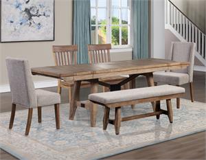 Rustic Ranch styling in a distressed dining package that is built to fit a large crowd. The dining table expands to a full 96 inches with two 12” leaves inserted and seats up to 10. The table is heavily distressed with saw rasping for an heirloom feel and a delightfully casual appearance, The driftwood finish will blend with many decors and complements the beige upholstered chairs perfectly.